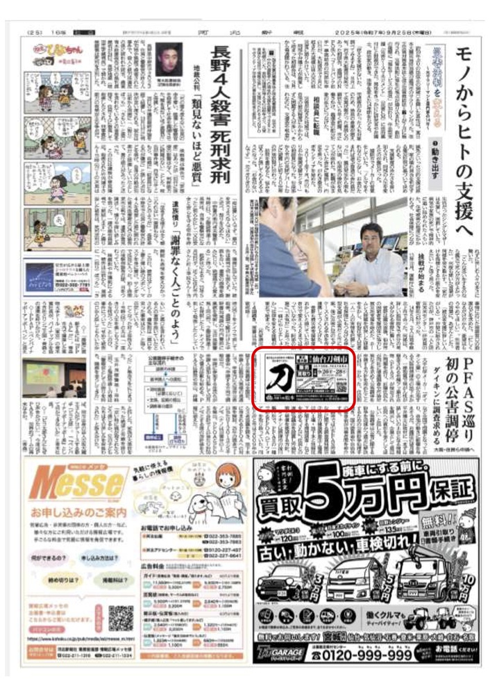 We have placed an advertisement in the 2025 edition of the "Urayasu Citizen's Handbook (half page 3)" published by Urayasu City, Chiba Prefecture, which borders Edogawa Ward. This Urayasu Citizen's Handbook contains information such as an overview of administrative services in Urayasu City, procedures, facility guides, and medical institutions. With the cooperation (advertising) of local organizations, companies, and shops, it is published at no financial cost to the city. We will continue our corporate efforts to become more widely known in the local area and to make Japanese swords more familiar to the people.