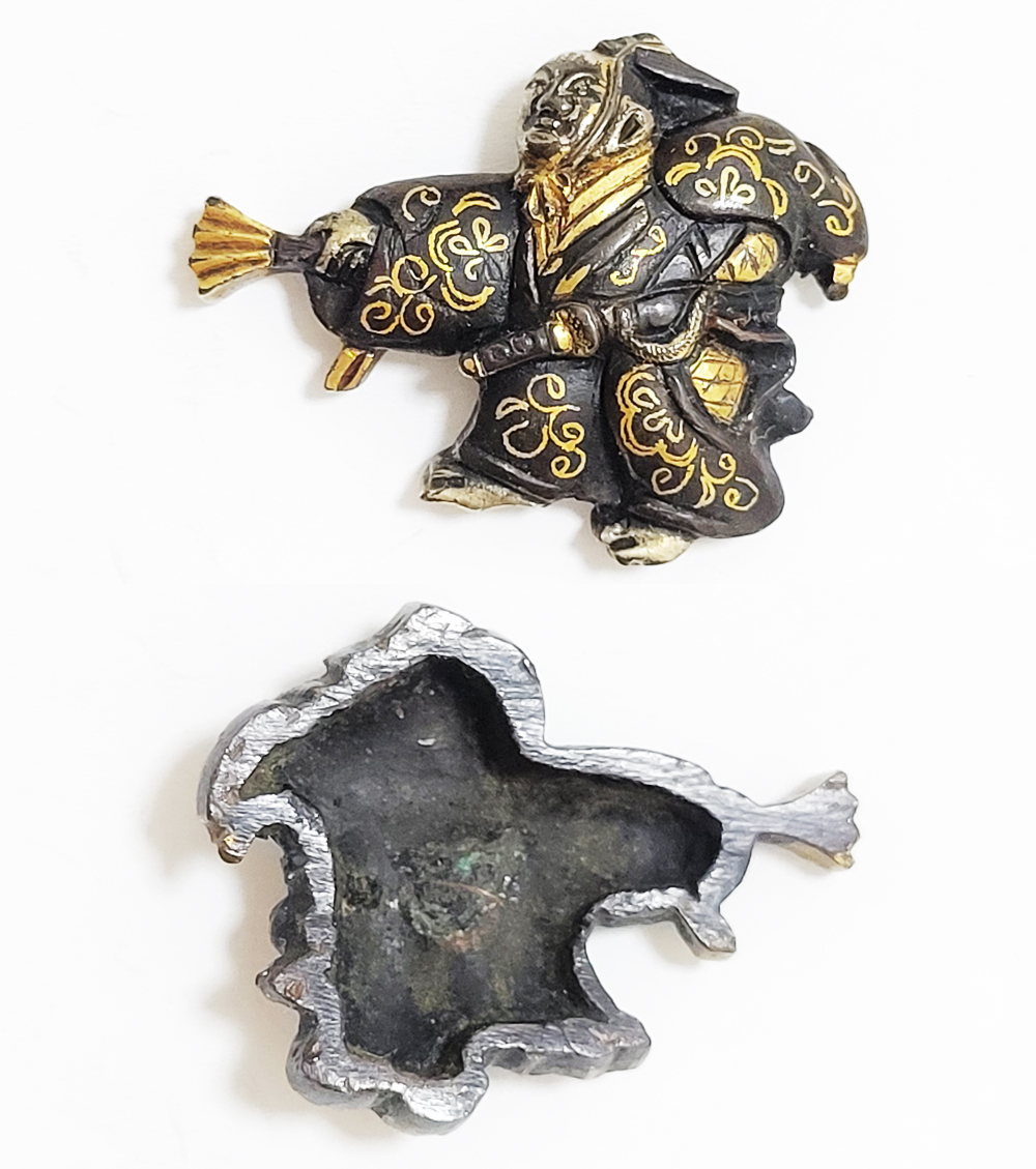| This set of menuki depicts "Sanbaso," one of the Noh plays, a dance performed at celebratory occasions for peace in the world, bountiful harvests, and prosperity of descendants. It is mumei, but has been attributed to the Kyo-kanagushi Tradition and has passed the Hozon Tosogu shinsa in 2010. |