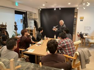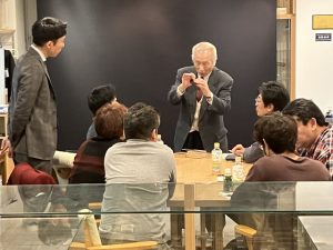 I held a study session for mid-career and young sword dealers participating in the Noda-kai Sword auction. The instructor was Nakahara Nobuo sensei. I hold these sessions every two months, building on previous sessions. This time, after viewing the swords and sword fittings, he explained topics such as the difference between the original hi (ubu-hi) and the later hi (ato-hi) on the blade, how to determine the attribution of unsigned swords, and the characteristics of various openwork tsuba from schools like Owari, Kanayama, Higo, Kyoto, and Akasaka. Since differences in knowledge directly impact business, everyone was serious and deepened their understanding. Afterwards, we enjoyed a lively Bonen-kai (year-end party) in a warm and friendly atmosphere.