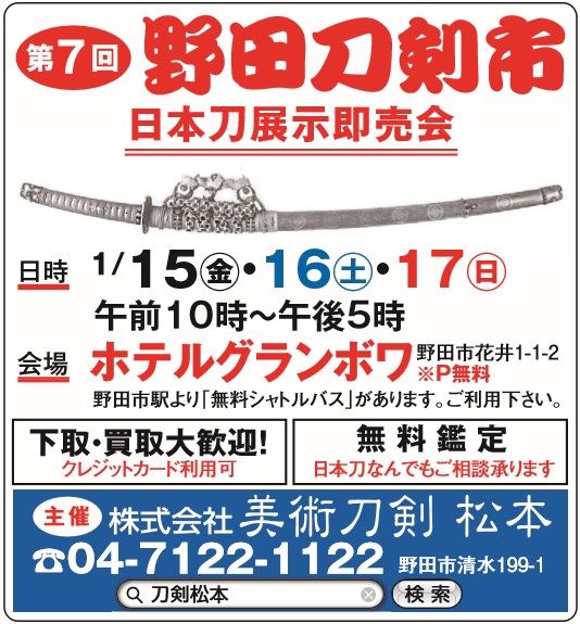今週金曜日から3日間開催する第2回千葉刀剣市の宣伝広告を、9月30日の地元紙「地域新聞」(15地域60万部)と10月1日の読売新聞 千葉県版 朝刊(82.1万部)におこないました。地元千葉県でより多くの馴染み客が出来ることを期待して精一杯頑張ります。