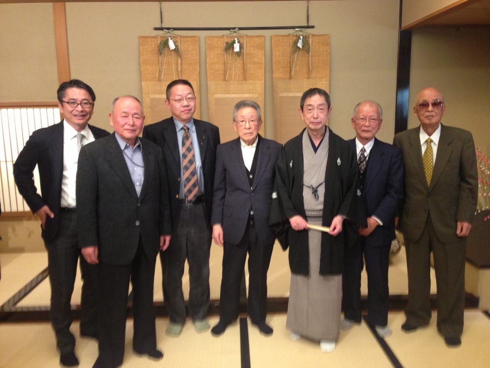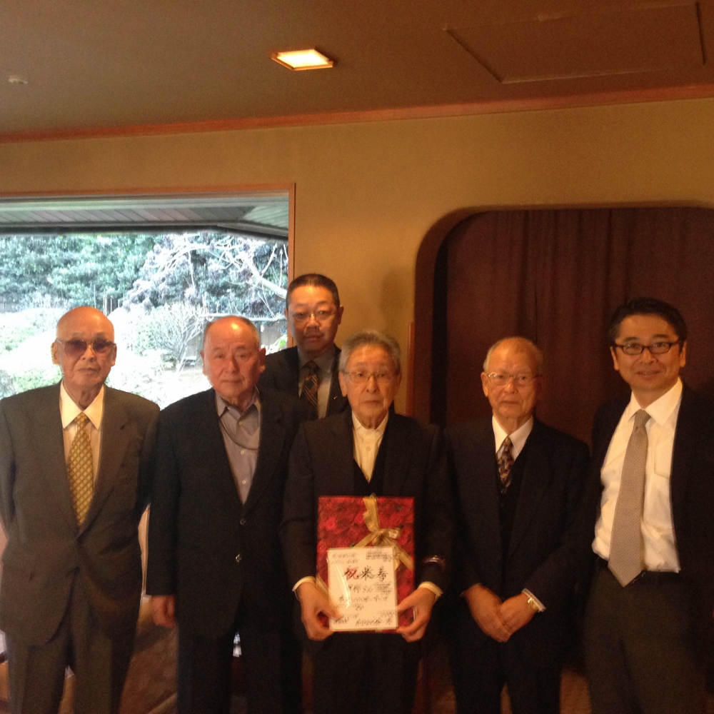 全国刀剣商業協同組合の専務理事で大刀剣市実行委員長でもある清水儀孝(浅草 晴雅堂)さんの還暦祝いを組合の有志でおこないました。「赤いちゃんちゃんこ」は深海理事長(銀座 長州屋)、飯田前理事長(目白 飯田高遠堂)から受け継がれている還暦衣装。専務理事を10年勤め大刀剣市の大黒柱となって奮闘している清水専務に心から感謝しお祝い致しました。