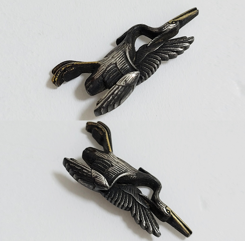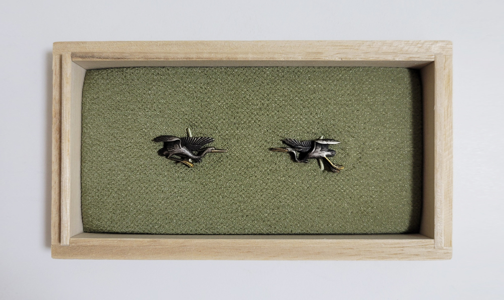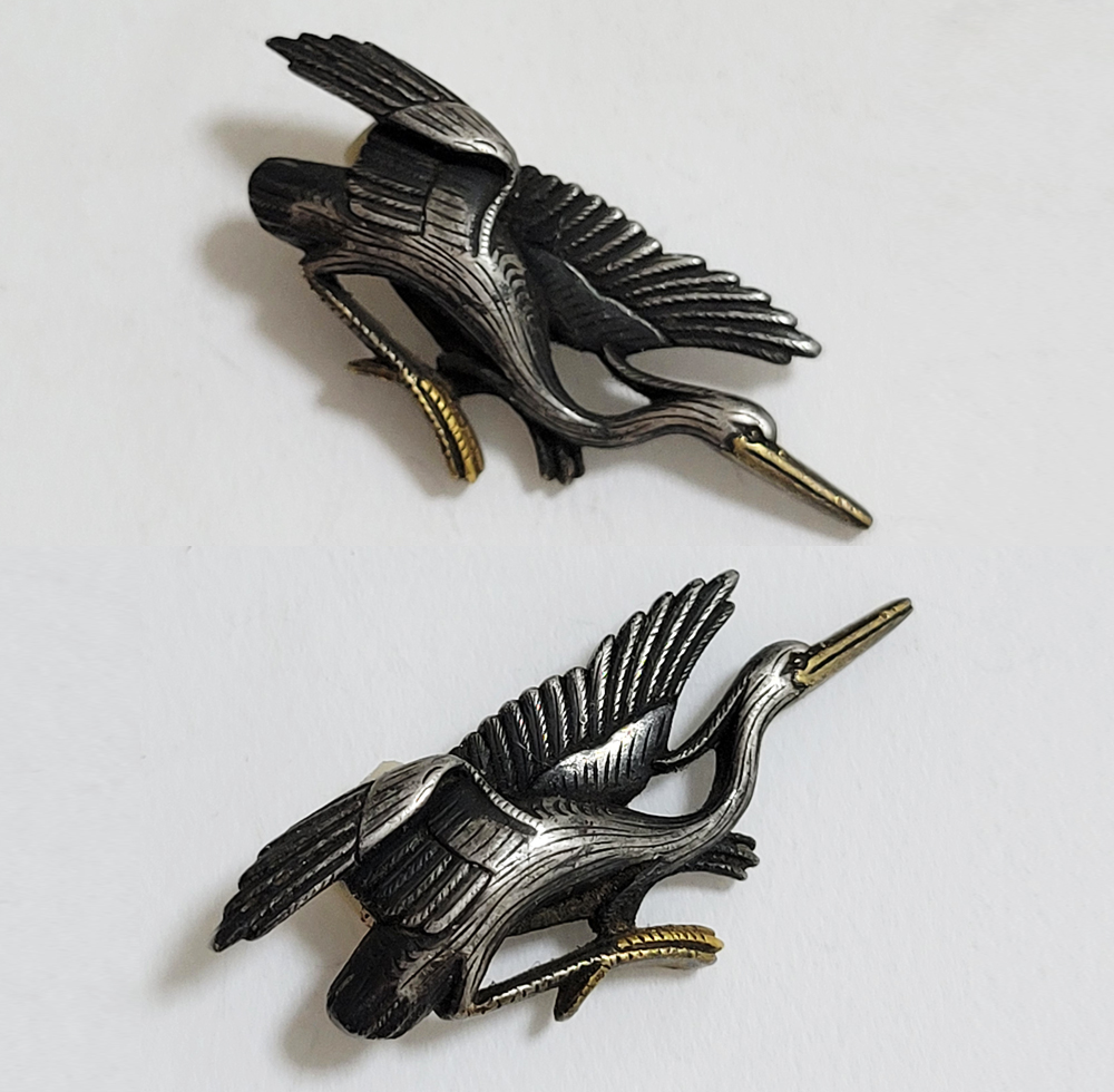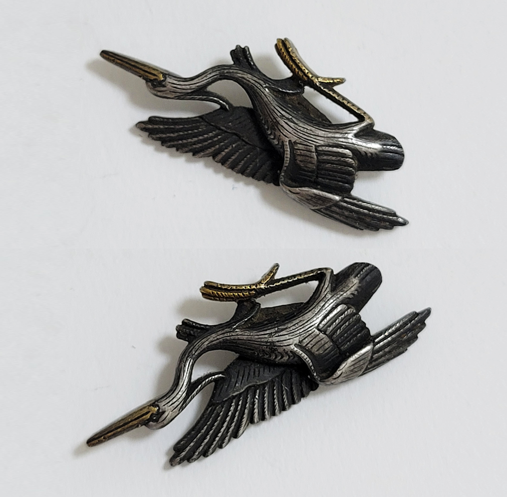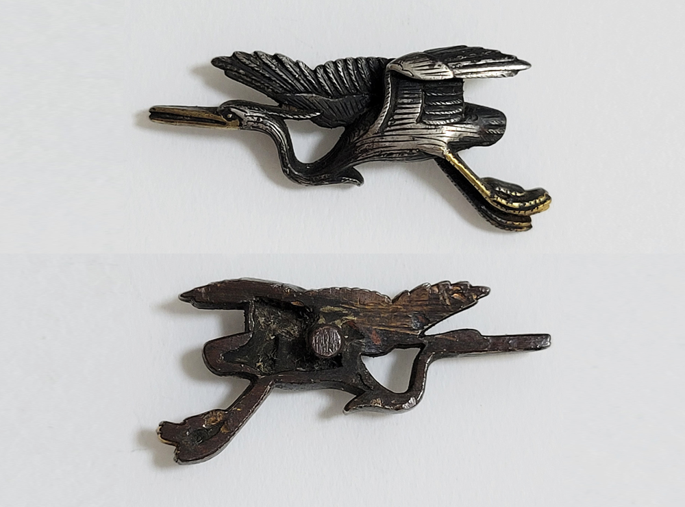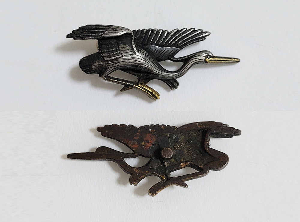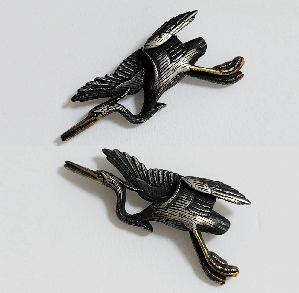 白鷺はその純白で高潔な姿から画題として好まれた。本作は飛翔する阿吽の鷺でめずらしい。銀に時代があらわれ垢抜けした目貫。