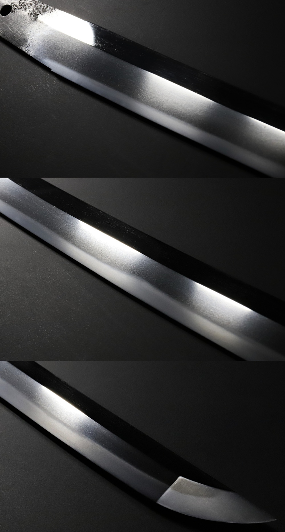 | 是次は福岡石堂派の祖。備前福岡一文字派の末孫と称した利英の子で寛永六年(1629)生まれ。明暦元年(1655)江戸にのぼり江戸石堂の武蔵大掾是一門人となり備前伝の奥義を学んで三年後に帰国し黒田藩工となる。天和元年(1681)53歳没。本作は福岡石堂是次のめずらしい直刃出来脇指。出来が良い。寒山先生鞘書き(昭和40年丙午1966)あり。令和6年(2024年)9月審査で特別保存合格。 |